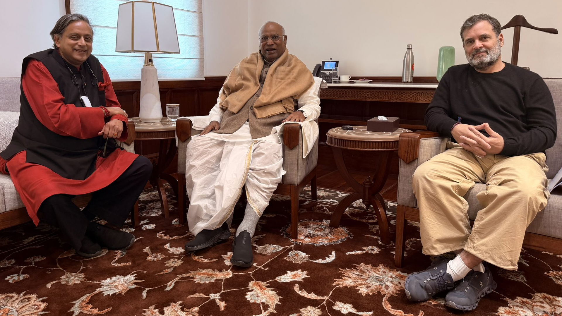 Senior Congress leader Shashi Tharoor met party president Mallikarjun Kharge and former Congress chief Rahul Gandhi in New Delhi on Thursday, sending out a strong message of unity amid reports of internal unease within the party. The meeting, held at Kharge’s office in the Parliament House complex, lasted for nearly two hours.